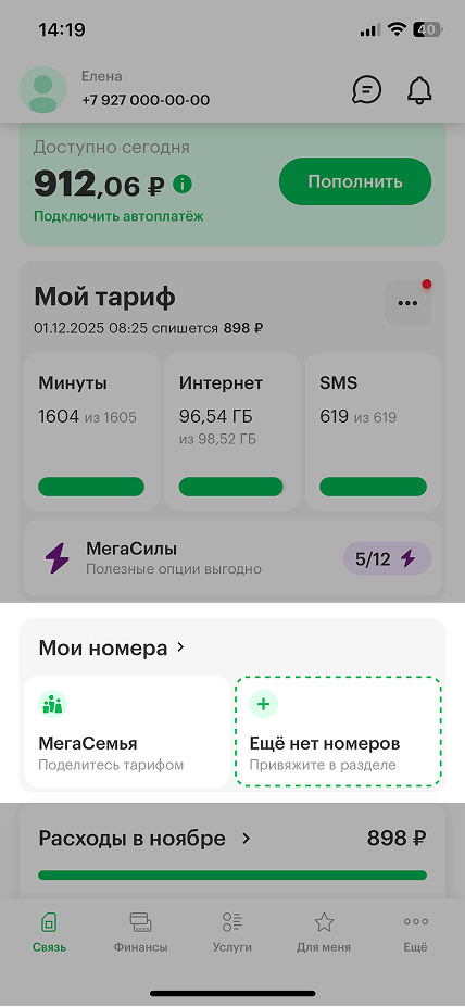 Мои номера — это раздел в Личном кабинете и приложении «МегаФон», куда можно добавить свои дополнительные номера, а также номера устройств и своих близких. Это удобно, когда нужно пополнить баланс, посмотреть расходы и управлять тарифом или услугами.